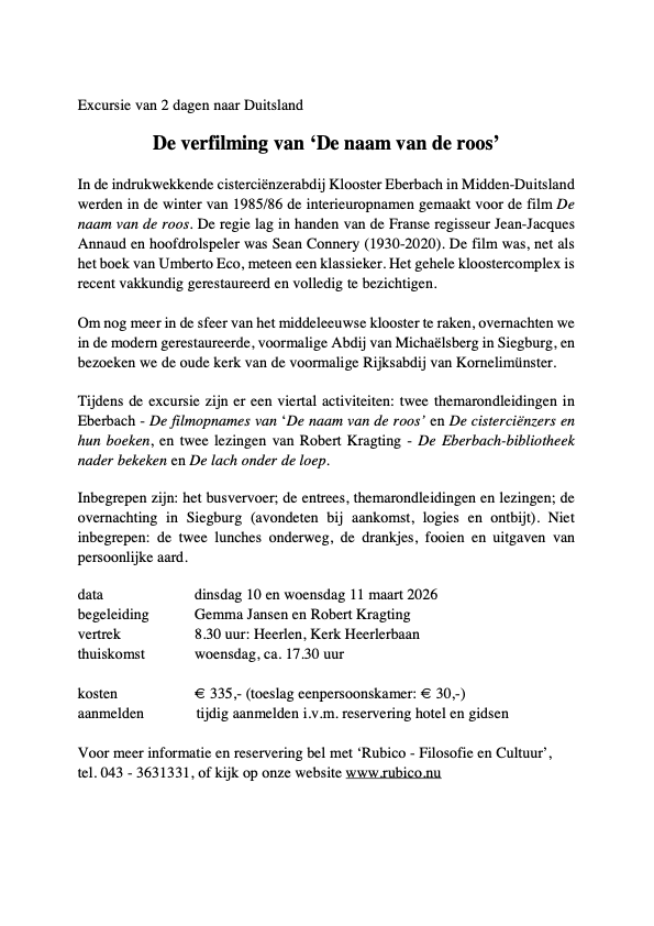 Voor meer informatie en reservering bel met ‘Rubico - Filosofie en Cultuur’, tel. 043 - 3631331, of kijk op onze website www.rubico.nu